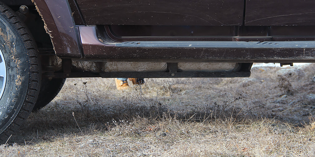 Выпуклость нового бака хорошо заметна под днищем «Патриота», вот только располагается она на высоте более от 32 сантиметров от земли. Примерно на том же уровне проходит система выпуска, а просвет под редукторами равен 210 миллиметрам. «Бугорок» или камень, способные создать ей угрозу, придется еще поискать – мы, например, не нашли. Многослойный пластик хорошо держит удар, что продемонстрировали заводские испытания. Чтобы окончательно убедить скептиков, бак по низу закрыли толстой стальной броней, как будто собрались перевозить в нем золотые слитки. В любом случае риск возникновения пожара из-за протечки топлива теперь минимален. Для этого, рассказывает директор НТЦ Ульяновского автомобильного завода Евгений Галкин, днище машины разделено на две зоны. Справа проходит холодная с топливной системой, слева – горячая, с выхлопной. Звучит убедительно, однако новый бак стоил УАЗу столько сил и нервов, что в следующий раз на заводе дважды подумают прежде, чем что-то менять.